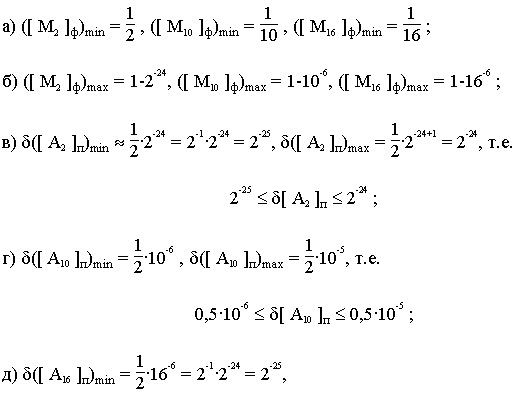 Пример 6. Компьютер имеет 32-разрядную ячейку памяти, в которую записываются числа с ПТ. Под мантиссу отводится 24 двоичных разряда, под порядок - 6. Определить точность представления для двоичных, десятичных и шестнадцатеричных чисел (q = 2, 10, 16). Решение.