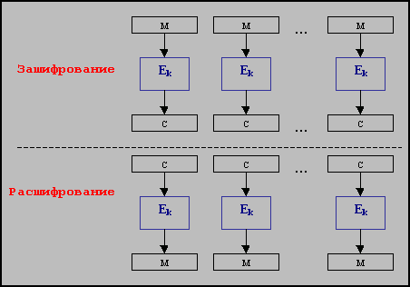 Исходный текст разбивается на блоки, равные размеру блока шифра. Затем с каждый блок шифруют независимо от других с использованием одного ключа шифрования. Графически это выглядит так:
