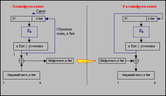 Расшифрование осуществляется аналогично. Т.е. для любого блока длины k операция зашифрования выглядит следующим образом: Ci=MiЕGi, где Gi - результат зашифрования некоторого вектора, являющегося заполнением сдвигового регистра. Главное свойство шифра - единичные ошибки не распространяются, т.к заполнение сдвигового регистра осуществляется не зависимо от шифротекста.